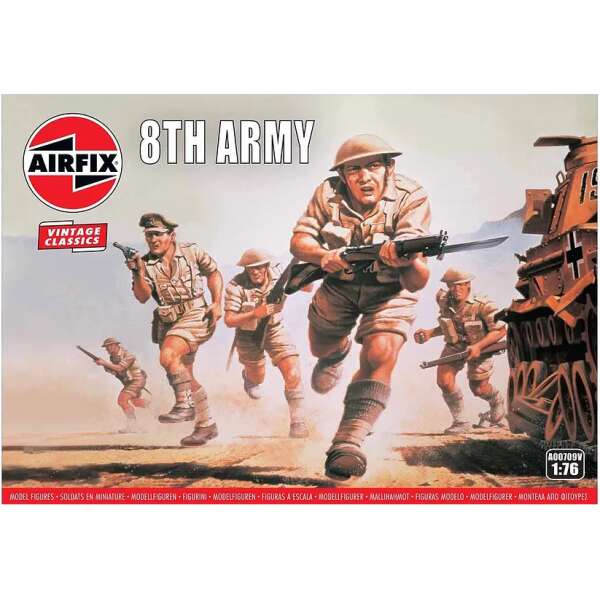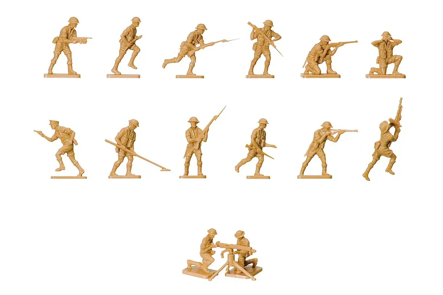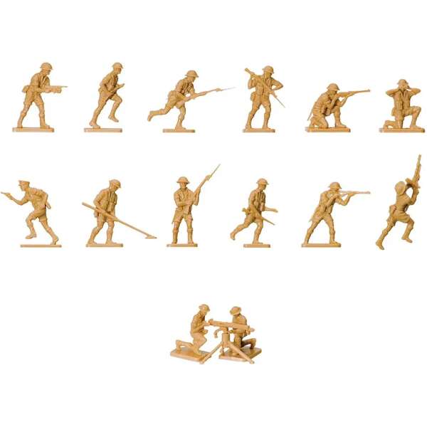 Commonly known as the ‘Desert Rats’, these 8th Army figures are wearing their shorts and steel helmets in this set. Included are mine detectors, machine gunners and riflemen.