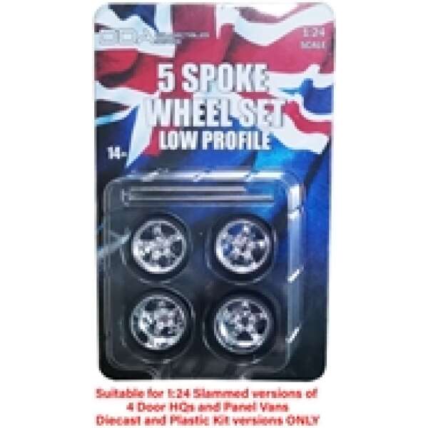DDA 1:24 Set of 4 x Low Profile Chrome 5 Spoke Wheels w/Tyres & Axles