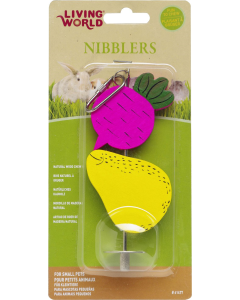 Living World® Nibblers Beet and Pear on Stick Wood Chew is a 2 colourful shaped wood chew on a chrome-plated rod for easy in-cage installation. Living World® Nibblers are specially designed chew toys that help improve your small pet’s dental health. They are also fun to chew on and are an excellent boredom buster. Made of all-natural materials such as wood, loofah, willow, corn husk and raffia. All Nibblers are colour-finished using non-toxic food colorants.