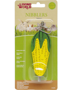 Living World® Nibblers Corn Cob on Stick Wood Chew is a colourful corn cob-shaped wood chew on a chrome-plated rod for easy in-cage installation.Living World® Nibblers are specially designed chew toys that help improve your small pet’s dental health. They are also fun to chew on and are an excellent boredom buster. Made of all-natural materials such as wood, loofah, willow, corn husk and raffia. All Nibblers are colour-finished using non-toxic food colorants