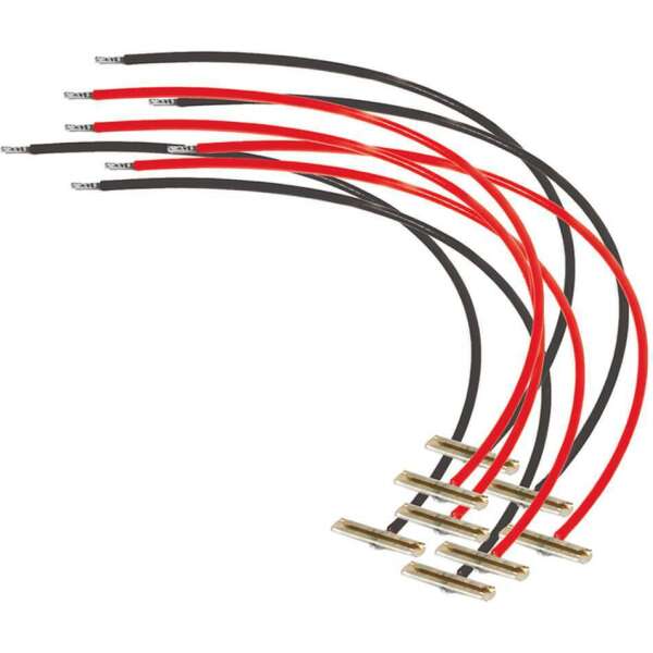 204mm track feed wires ready soldered to rail joiners. Quick and easy to use, avoids the risk of damage to sleepers from soldering irons. Easily extended using PL-39 Terminal Blocks and PL-38 Red and Black wire. 4 pairs per pack.