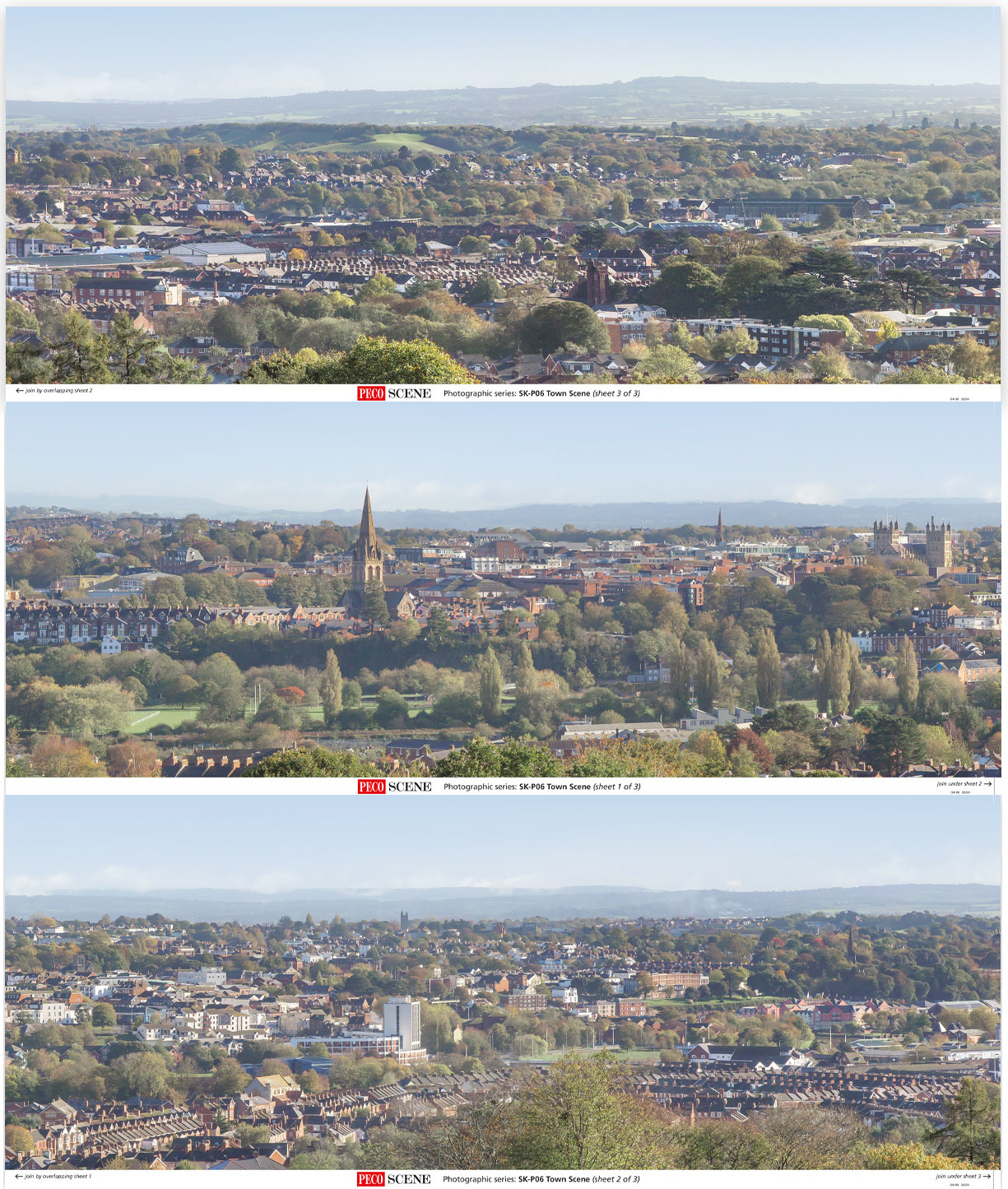 Supplied in a square-section tube, the three separate sheets will match perfectly together to form a continuous run of 2400mm (95in), and reaching to a height of 333mm (13in). Future backscenes will match at either end allowing longer runs of scenery throughout the full length of a layout.