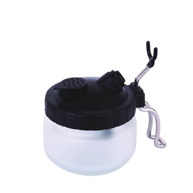 Airbrush cleaning pot, glass with plastic lid, used to spray-clean airbrush.